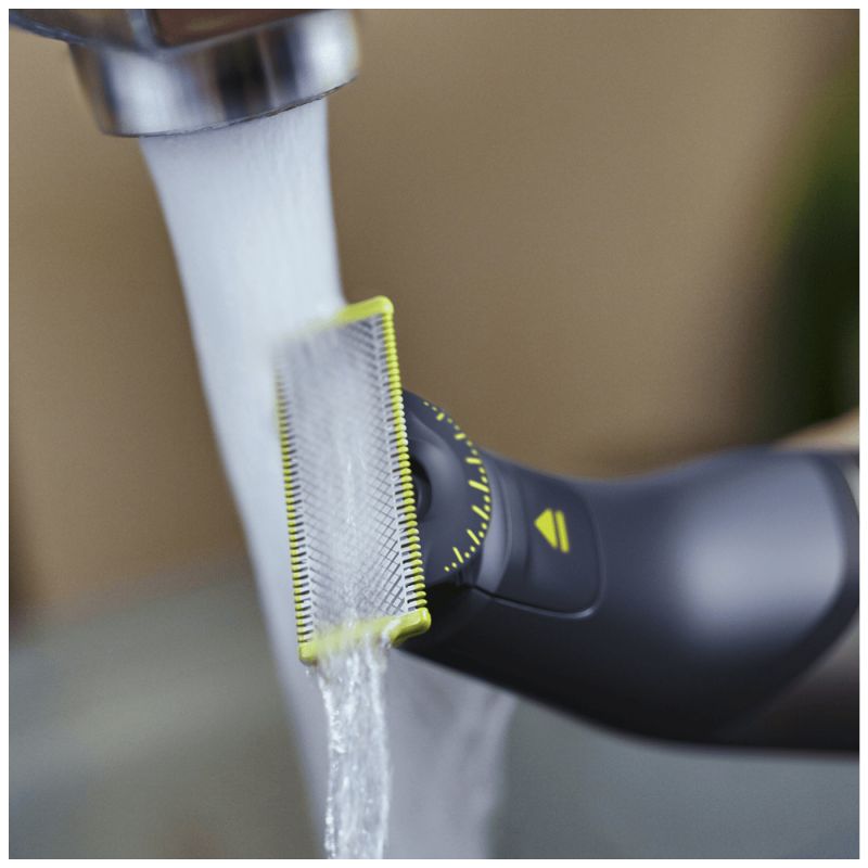 Philips OneBlade ima revolucionarnu tehnologiju za dotjerivanje dlačica na tijelu. Može brijati bilo koju dužinu dlačica. Njegov dvostruki zaštitni sustav – premaz za bolje klizenje u kombinaciji sa zaobljenim vrhovima – olakšava brijanje te ga čini ugodnijim. Njegova tehnologija brijanja obuhvaća rezač koji se brzo pomiče (12 000x u minuti), tako da je učinkovit čak i na dužim dlačicama.