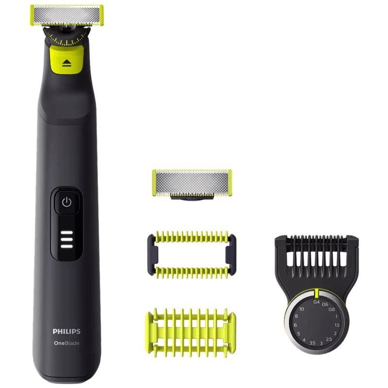 Philips OneBlade Pro revolucionarni je hibridni aparat za oblikovanje koji može podrezivati, brijati te oblikovati jasne linije i rubove bez obzira na dužinu dlačica. Upotreba više aparata u nekoliko koraka stvar je prošlosti. OneBlade sve obavlja sam. Philips OneBlade ima revolucionarnu tehnologiju za dotjerivanje dlačica na tijelu. Može brijati bilo koju dužinu dlačica. Njegov dvostruki zaštitni sustav – premaz za bolje klizenje u kombinaciji sa zaobljenim vrhovima – olakšava brijanje te ga čini ugodnijim. Njegova tehnologija brijanja obuhvaća rezač koji se brzo pomiče (12 000x u minuti), tako da je učinkovit čak i na dužim dlačicama. Inovativne oštrice 360 kreću se u svim smjerovima i prilagođavaju se svakoj konturi vašeg lica kako bi održale ugodan dodir s kožom, dok istodobno jamče neprekidnu kontrolu. Jednostavno podrezivanje i brijanje , čak i na najteže dostupnim područjima, uz manje poteza i veću ugodnost. Podrezujte bradu na ravnomjernu dužinu priloženim prilagodljivim preciznim češljem. Odaberite jednu od 14 postavki dužine za postizanje sve od jednodnevne brade do trodnevne ili duže brade. Ergonomska drška za udobno rukovanje, češalj s 14 postavki duljine (0,4 – 10 mm), štitnik za kožu koji se postavlja pritiskom, češalj za dlačice na tijelu koji se postavlja pritiskom LED indikator baterije s 3 razine, vrijeme rada 90 min., vrijeme punjenja 1h, Li-Ion baterija Za vlažno i suho korištenje Zamjenska glava QP210, QP220, QP230, QP610, QP620