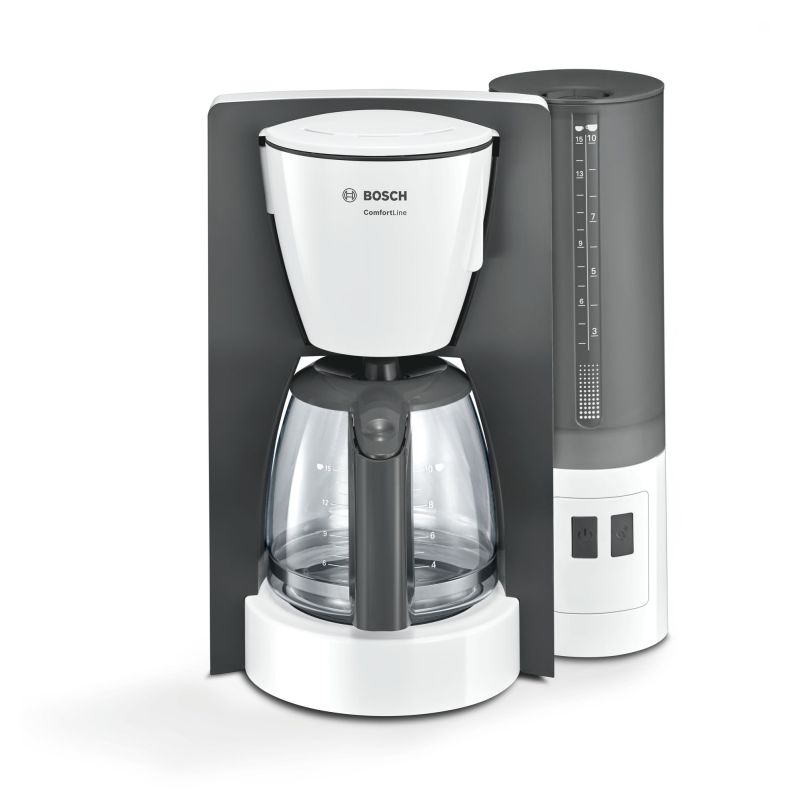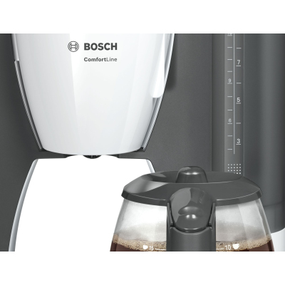 BOSCH aparat za filter kafu TKA6A041 ComfortLine; Boja: BIJELA; 900-1200W; Stakleni vrč za 10/15 šoljica kafe; Odvojivi držač filtra, Drip stop; EasyDescale3: praktična značajka za uklanjanje kamenca za dugotrajno uživanje, PL