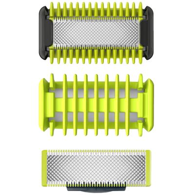 Philips OneBlade Face + Body podrezuje, oblikuje i brije dlačice bilo koje dužine. Sadrži jednu oštricu za lice, jednu sa štitnikom za kožu za dlačice na tijelu te češalj za dlačice na tijelu.