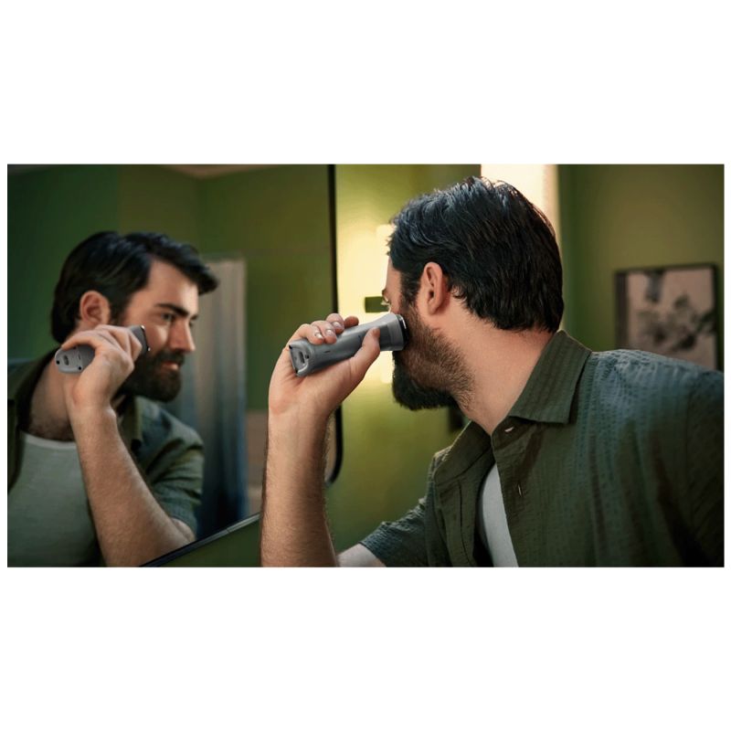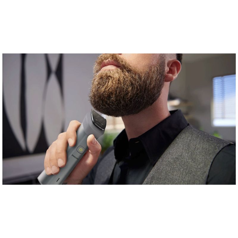 Ovaj višenamjenski trimer namijenjen je kompletnom uređivanju brade, kose i tijela. Dolazi s 12 različitih nastavaka koji omogućuju precizno oblikovanje i šišanje za sve stilove. Samoštrareći čelični noževi zadržavaju oštrinu bez potrebe za uljem, dok tehnologija BeardSense automatski prilagođava snagu prema gustini dlačica. Trimer je potpuno vodootporan, baterija traje do 120 minuta, a ergonomska gumirana drška osigurava udobno i sigurno rukovanje.