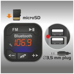 FM modulator (Transmitter) 5 in 1, bežično povezivanje na bilo koji auto radio ( 87,6 - 107,9 MHz ), Bluetoth veza za telefon - Handsfree, prijem poziva, odbijanje poziva, biranje broja, ugrađen mikrofon sa veoma kvalitetnim zvukom, Bluetooth stereo reprodukcija glazbe, MP3 reprodukcija , reprodukcija sa microSD memorijske kartice, dvostruki USB punjač za telefon, 5 V / 2.1 A, stereo audio ulaz 3.5 mm. Napajanje 12 V / 24 V. Nasljednik modela FMBT 74