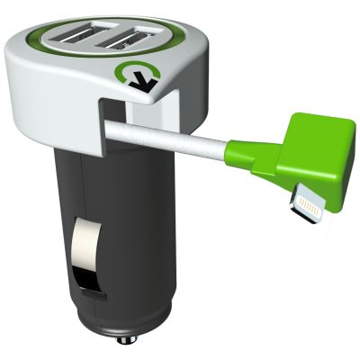 Univerzalni USB Auto punjač, 2 x USB utor, Lightning konektor, dužina kabela 18cm, ulazni napon 12V - 24V, izlazni napon 5V / 3.1A