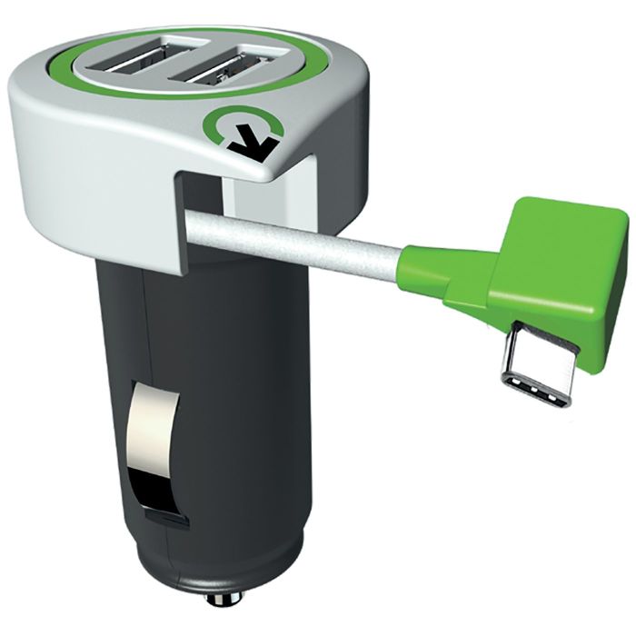 Univerzalni USB Auto punjač, 2 x USB utor, type C konektor, dužina kabela 18cm, ulazni napon 12V - 24V, izlazni napon 5V / 3.1A