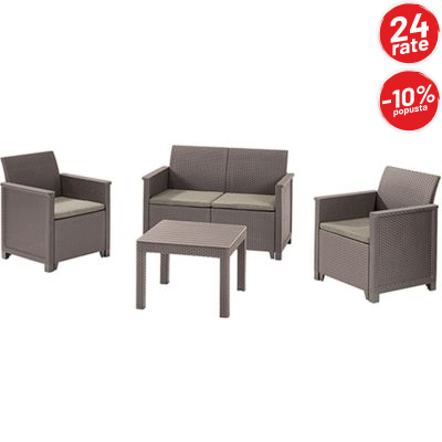 Set je izrađen od kvalitetne plastike sa izgledom ratana, što omogućava dug vijek trajanja, otpornost na vremenske uslove i vrlo jednostavno održavanje. Udobni jastuci koji dolaze u pakovanju dodatno povećavaju komfor, pa je sjedenje ugodno i tokom dužeg boravka na terasi ili u bašti.