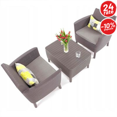 Baštenski set Salemo smeđi savršen je izbor za uređenje balkona, terase ili dvorišta. Zahvaljujući elegantnom dizajnu sa teksturom koja imitira prirodni ratan, ovaj set daje moderan i luksuzan izgled svakom prostoru, a kompaktne dimenzije omogućavaju da se lako uklopi i na manje balkone ili terase.