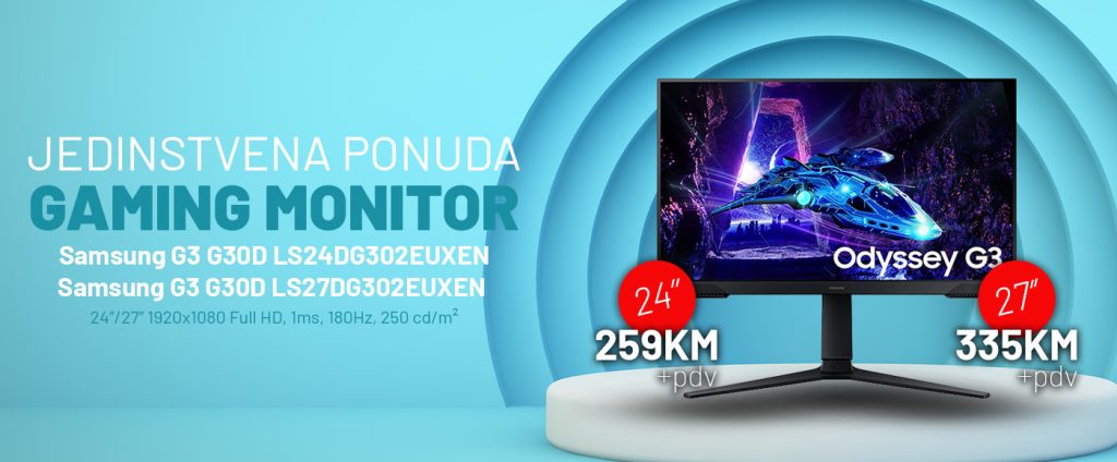 Za samo 259 KM možete nabaviti 24” Samsung G30D Odyssey gaming monitor, dok ukoliko ste ljubitelji većih dijagonala ekrana, navedeni monitor u verziji 27” možete nabaviti za 335 KM!