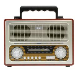 Prenosivi radio prijemnik, 4in1, RETRO dizajn, bežična Bluetooth veza, MP3 reprodukcija, žičani audio ulaz ( AUX IN ), 3- pojasni AM / FM / SW radio. Volume indikator 2 x 5 LED, klasična drvena zvučna kutija sa ručkom za nošenje. Višestruko napajanje: ugrađena baterija, 4 x D LR20 1,5V baterije, vanjski adapter 6V, kabel za napajanje AC.