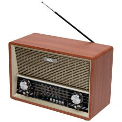 Radio prijemnik, 4in1, RETRO dizajn, bežična Bluetooth veza, MP3 reprodukcija, žičani audio ulaz ( AUX IN ), 4- pojasni AM / FM / SW1 / SW2 radio. priključak za slušalice 3.5 mm, klasična drvena zvučna kutija sa dva zvučnika.
