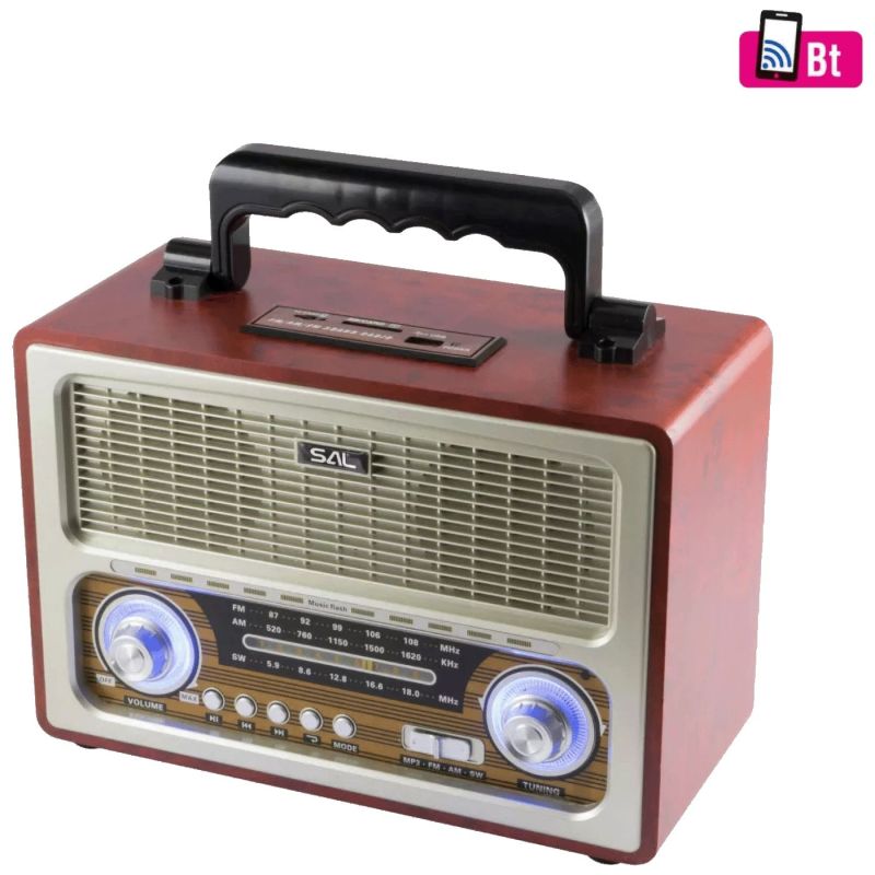 Kako možete uživati u svojoj omiljenoj muzici i radio stanicama uz pomoć elegantnog i svestranog uređaja? Retro džepni radio SAL RRT3 je 4-u-1 multimedijalni uređaj koji kombinuje klasični dizajn sa modernom tehnologijom. Bežična Bluetooth povezivost, mogućnost reprodukcije MP3 datoteka, AUX ulaz i 3-pojasni AM-FM-SW radio osiguravaju da su zadovoljene sve vaše muzičke potrebe. Elegantna drvena zvučna kutija i ručka za nošenje osiguravaju udobnu upotrebu i estetski izgled.
