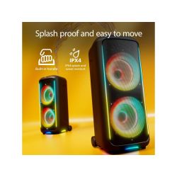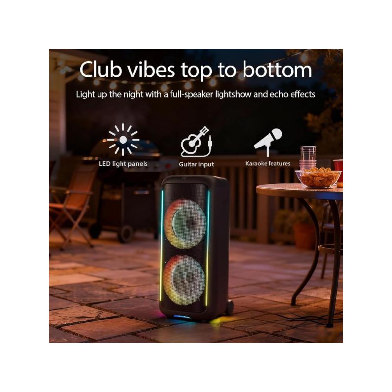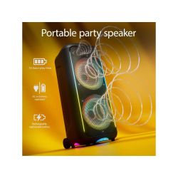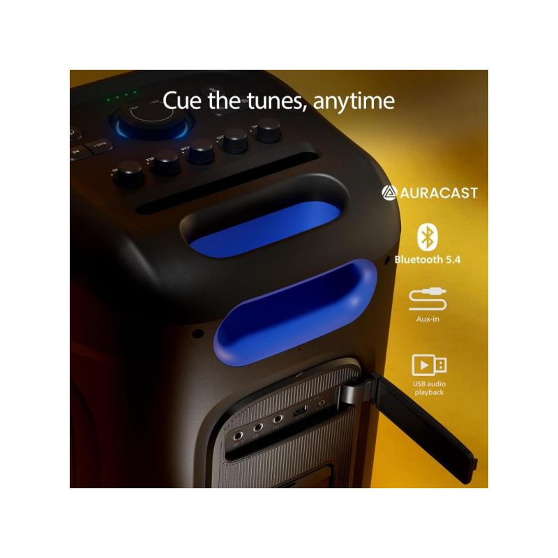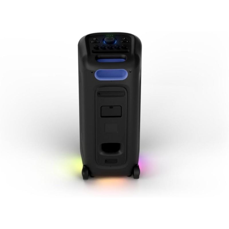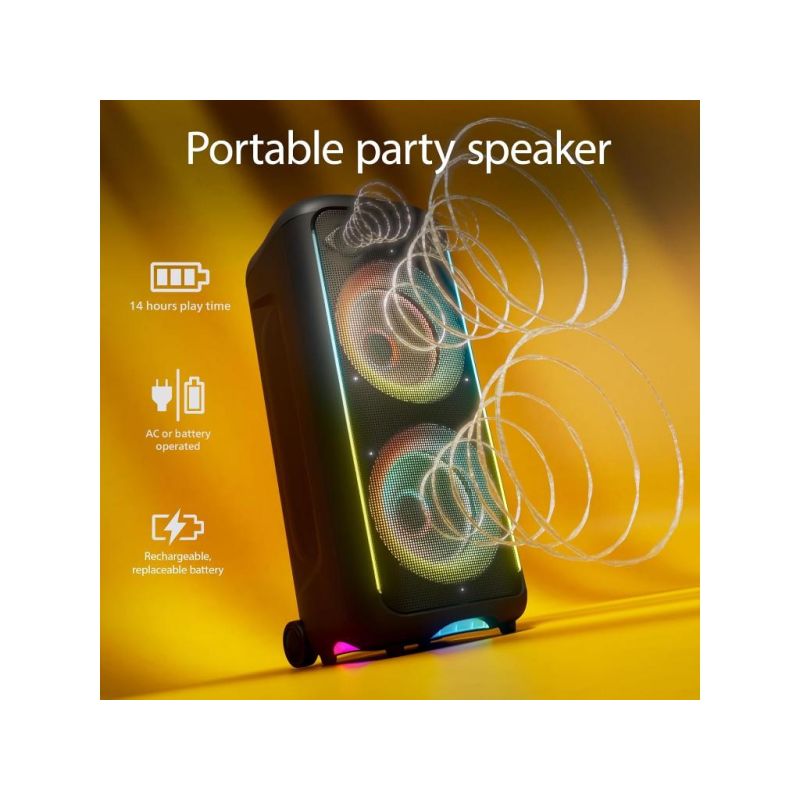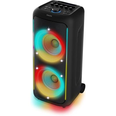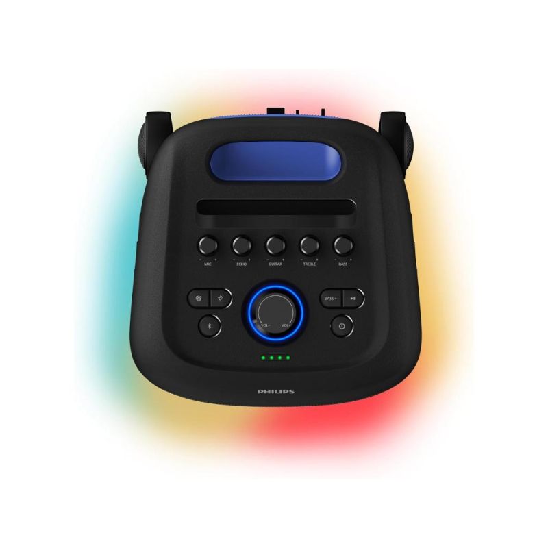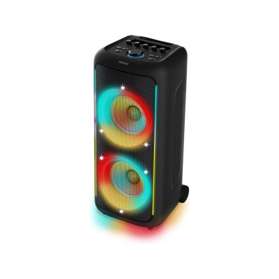 Philips TAX5000E/10 BT zvučnik; Maks. 200 W (100 W RMS), Bass+; Bluetooth Auracast i TWS; Svjetlosni efekti; Zamjenjiva baterija, AC ulaz; ux ulaz i reprodukcija s USB-a; ulaz za mikrofon i gitaru; baterija do 14h-punjenje 4h; ručka za nošenje IPX4