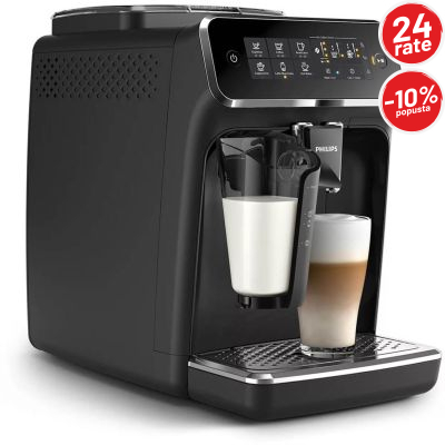 Philips EP3341/50 nudi uživanje u raznovrsnim napicima – od aromatičnog espressa do kremastog cappuccina i latte macchiata. Na intuitivnom ekranu osjetljivom na dodir birajte između 4 unaprijed podešena napitka, dok LatteGo mliječni sistem stvara bogatu pjenu i čisti se za svega 15 sekundi.