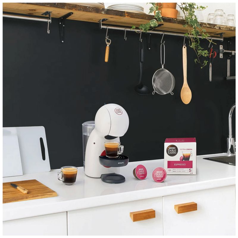 NESCAFÉ® Dolce Gusto® Piccolo XS aparat odlikuje se kompaktnim dizajnom i modernim stilom, čineći ga savršenim dodatkom svakoj kuhinji. Njegova mala veličina omogućava postavljanje čak i u najsitnijim prostorima, dok elegantni bijeli finiš unosi dozu sofisticiranosti.