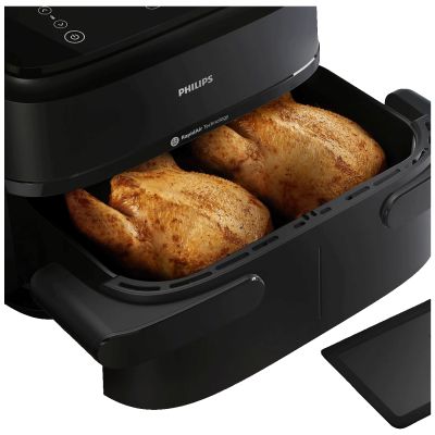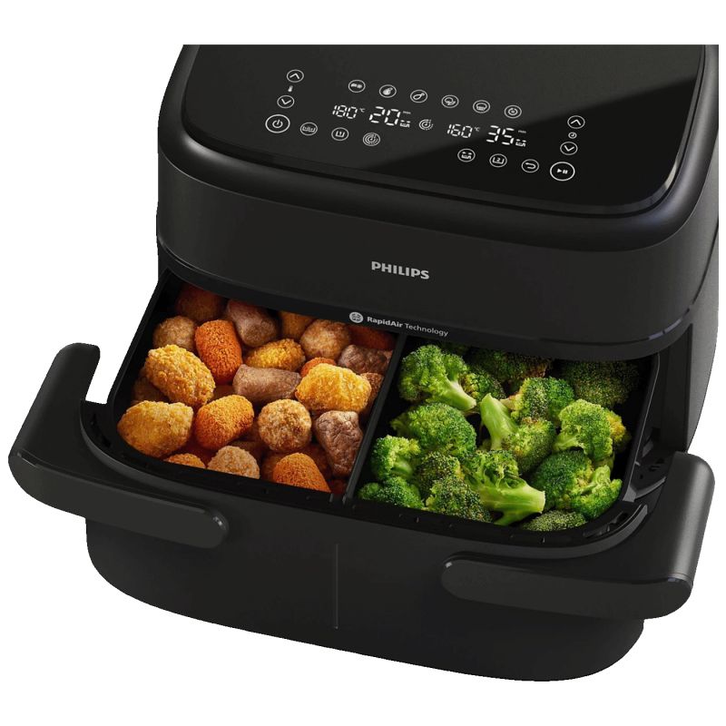 Zahvaljujući dvostrukoj košari, moguće je istovremeno pripremati dvije različite vrste hrane sa različitim postavkama temperature i vremena. Rapid Air tehnologija osigurava ravnomjernu cirkulaciju vrućeg zraka kako bi hrana bila hrskava izvana, a mekana iznutra. Intuitivna kontrolna ploča omogućava jednostavno podešavanje, dok kompaktan dizajn olakšava svakodnevnu upotrebu u kuhinji.