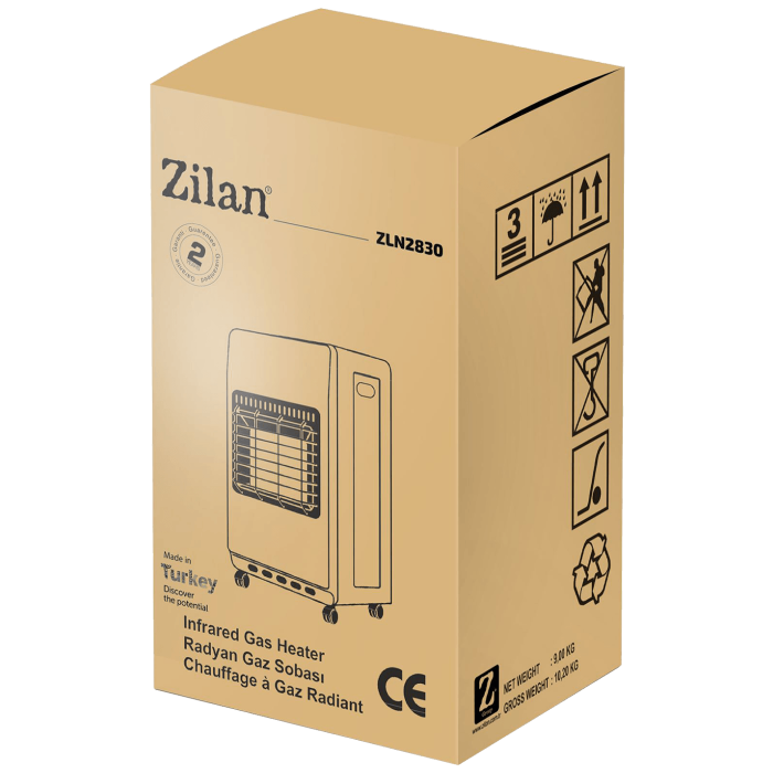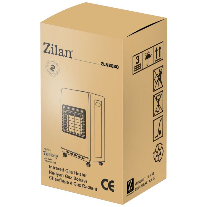 Plinska grijalica, ZLN2830, snaga 1400 / 2800 / 4200 W, 3 keramičke grijaće ploče izrađene od specijalnog keramičkog materijala sa mikro perforacijama sa visokom toplotnom otpornošću i sa uzastopnim paljenjem, piezo - električno paljenje, 3 razine snage 1400 / 2800 / 4200 W, volumen grijanja 120 m³, potrošnja plina 300 g/h, 4 rotirajuća kotača za 360°, diemnzije 430 x 380 x 760 mm