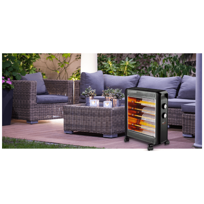 Grijalica sa halogenim ( kvarcnim ) grijačem, podesiva snaga u 2 nivoa 1100 / 2200 W, integrirani termostat, zaštita od pregrijavanja, sigurnost pri prevrtanju, kompaktna i praktična s okretnim kotačima i ručkom za nošenje, IPX4 zasštita, pogodna za upotrebu vani, napajanje 220 - 240 V ~ 50 / 60 Hz, boja crna