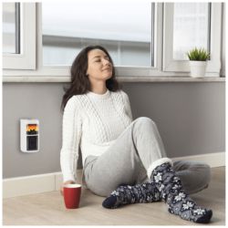 Grijalica FKH 401, učinkovita, elegantna, jednostavna sa ugodnim efektom plamena, grijalica se uključuje direktno u električnu utičnicu, 400 W snage, zaslon, elektronički termostat, podesiva temparatura 15-45 °C, timer do 12 sati, funkcija samo ventilator, automatsko isključivanje u slučaju pregrijavanja, razina buke 58 dB, napajanje 230 V ~ / 50 Hz, dimenzije 95 x 185 x 70 mm