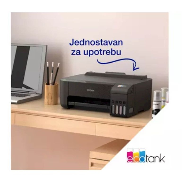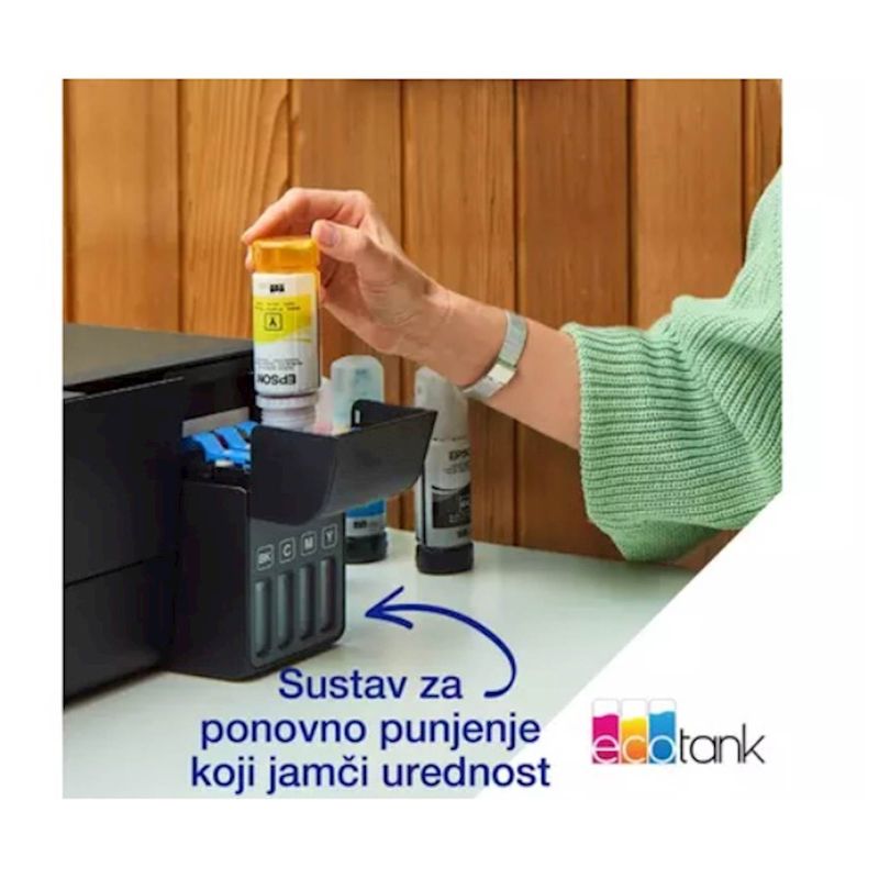 EcoTank omogucuje ispisivanje kod kuce bez briga – spremnici s tintom iznimno visokog kapaciteta omogucuju nadopunjavanje bez nereda, a poseban dizajn bocica je osmišljen tako da se mogu umetnuti samo ispravne boje. Posjeduje prednji spremnik za tintu na kojem je lako može vidjeti kada je potrebno dodatno punjenje. Aplikacija Epson Smart Panel omogucuje vam potpuno upravljanje pisacem s pametnog uredaja. Možete ispisivati dokumente i fotografije, postaviti, nadgledati i rješavati probleme sa svog telefona ili tableta. Uz tehnologiju bez topline Micro Piezo možete uživati u smanjenoj potrošnji energije i manjoj potrebi za zamjenskim dijelovima. Glava pisaca takoder je predinstalirana, pa se pisac postavlja bez muke.