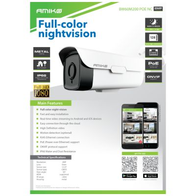 Amiko Home Kamera IP, 2MP, Color Night, SD utor, 6mm, IP66 - BW60M200 POE NC