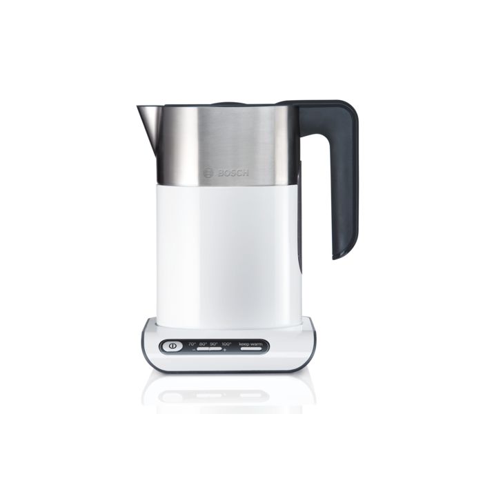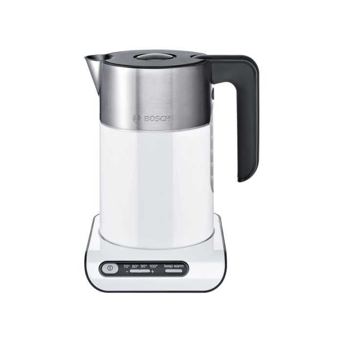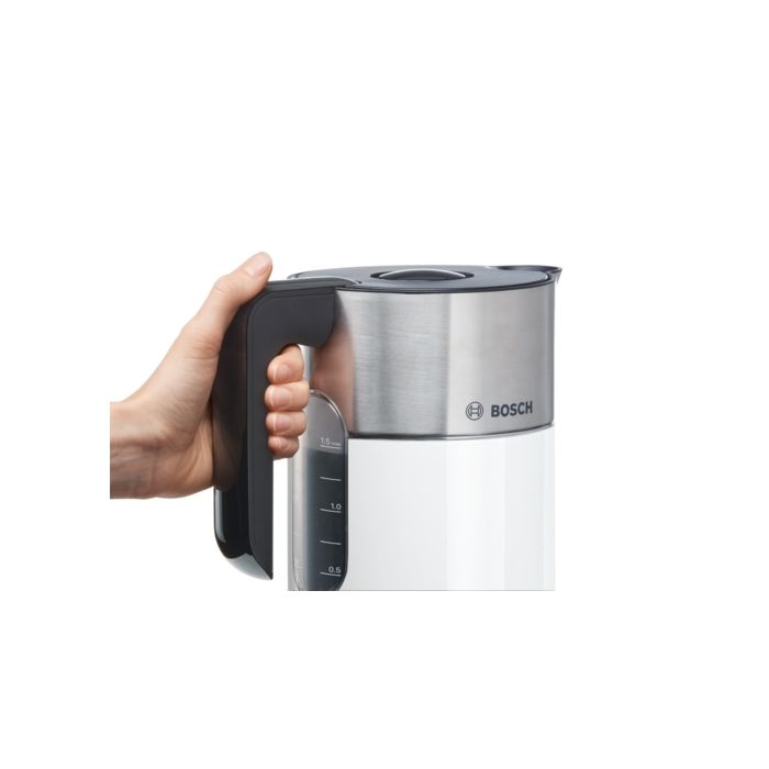 Bosch Kuhalo za vodu TWK8611P; Styline; 2400 W; 1,5 l; TemperatureControl: 70C, 80C, 90C, 100C; Keep Warm Function; Inox dno, grijači pokriveni; Uklonjiv filtar; Prikaz razine vode; Otvaranje na gumb; Zaključavanje poklopca; Easy storage; Bijela