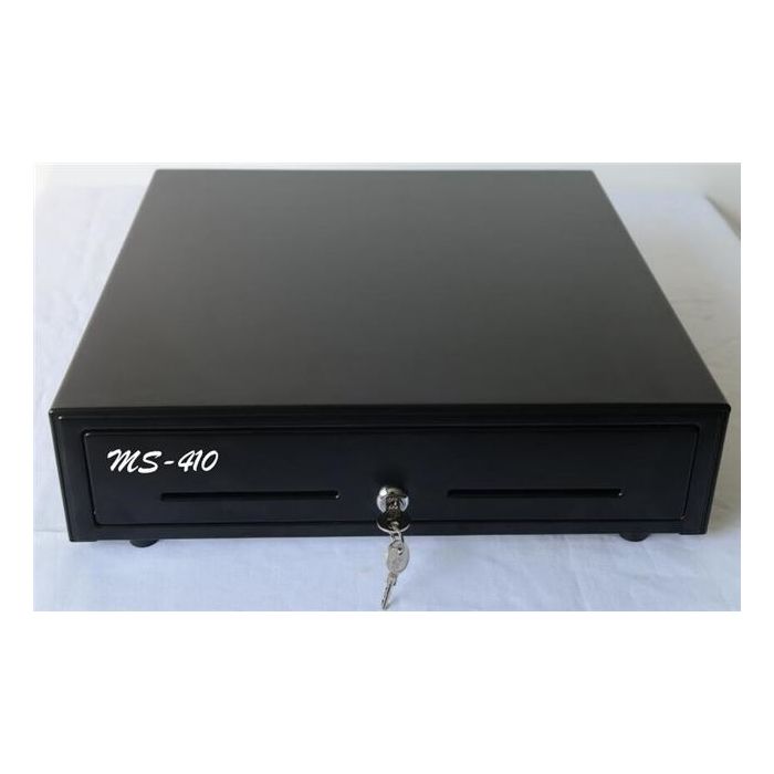 Ladica za novac MS 410, 5 novčanice/ 8 kovanice, Epson standard RjJ11, RJ12, 410(Š)x420(D)x100(V), metalna konstrukcija, 7,6kg, 6V/9V/12/24V crna