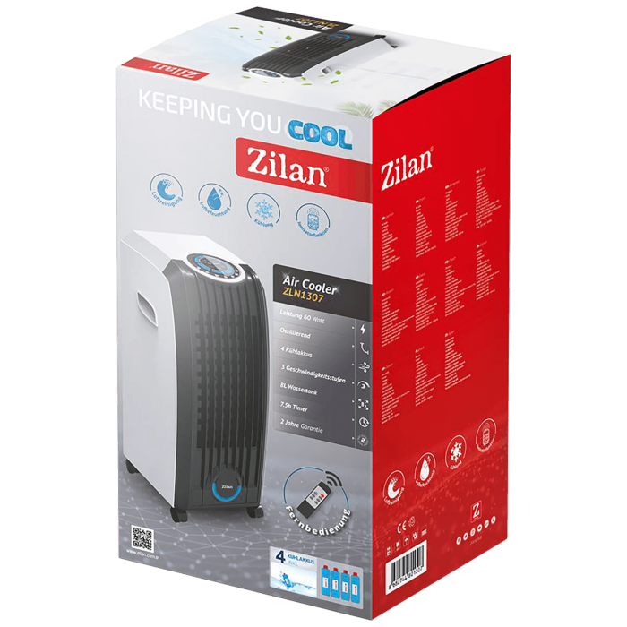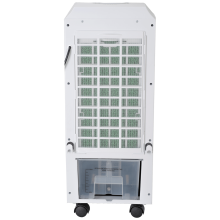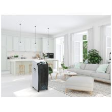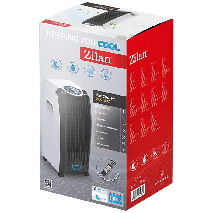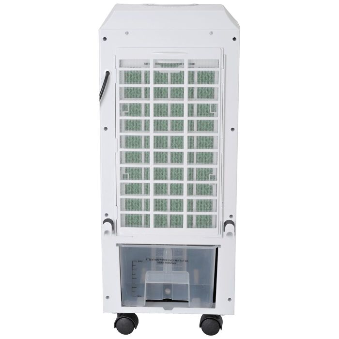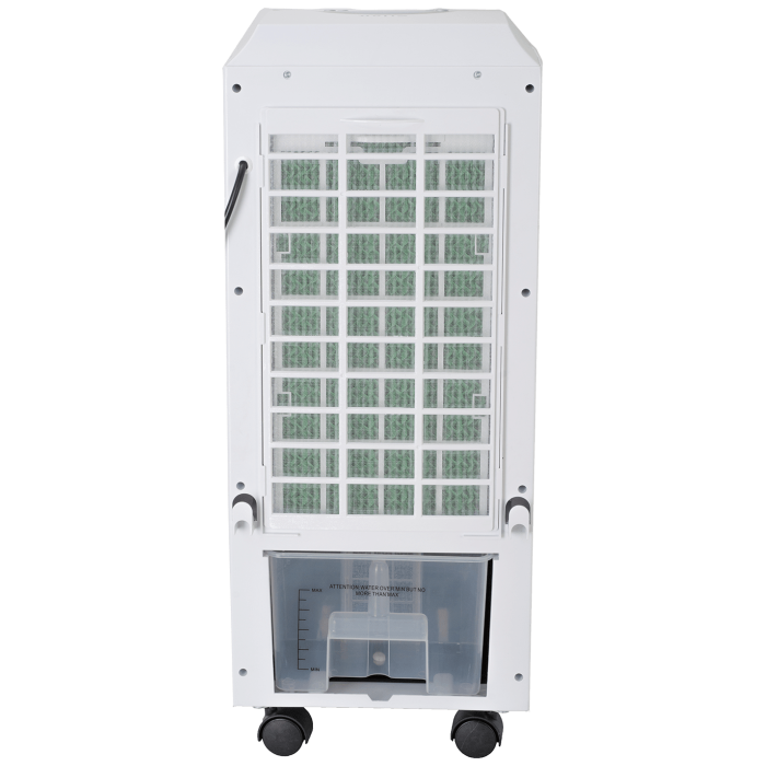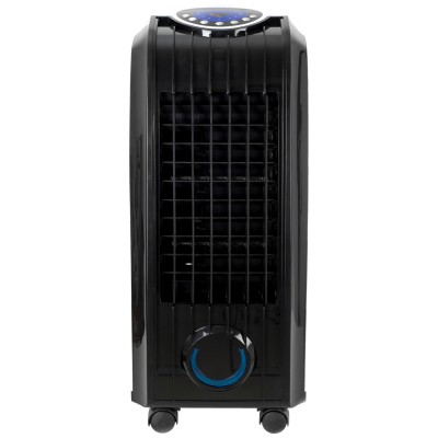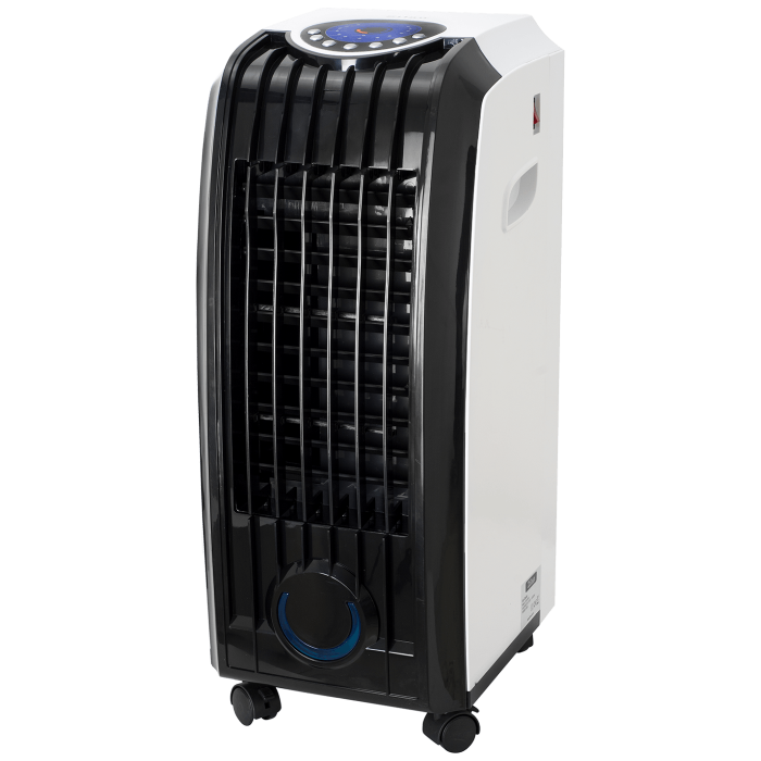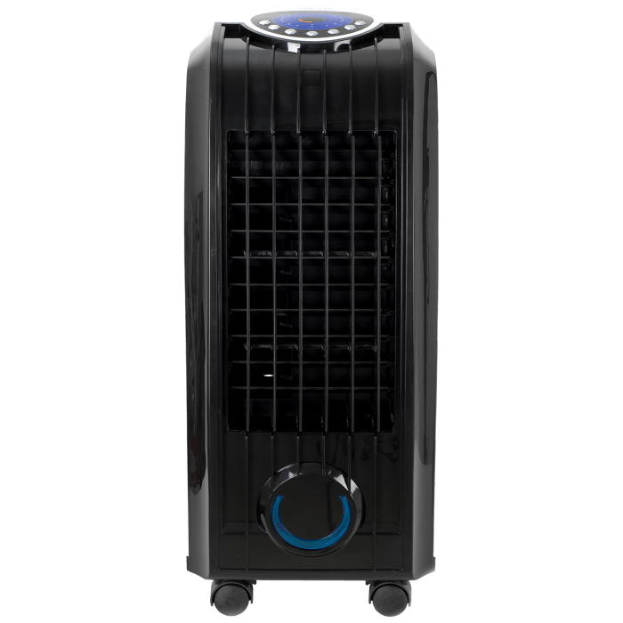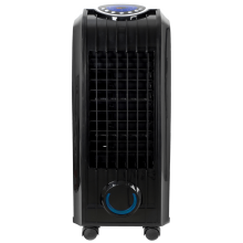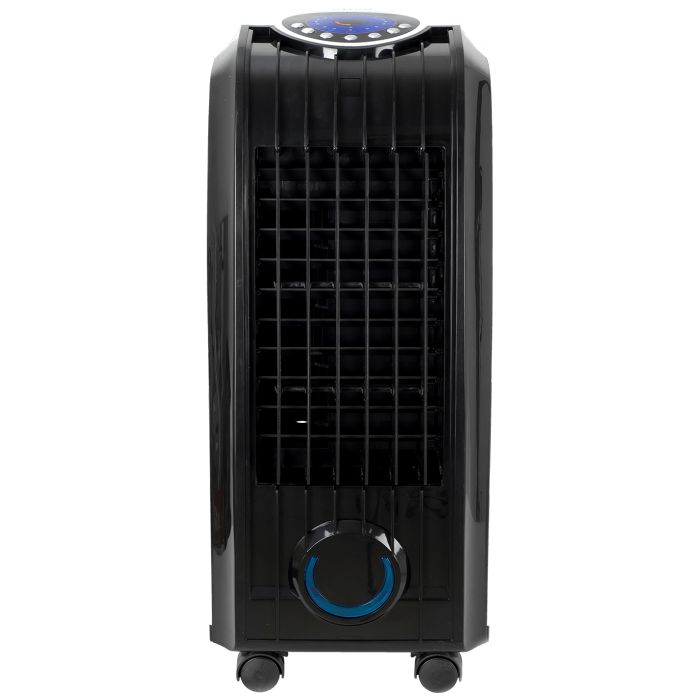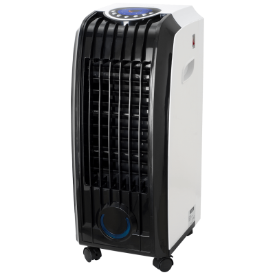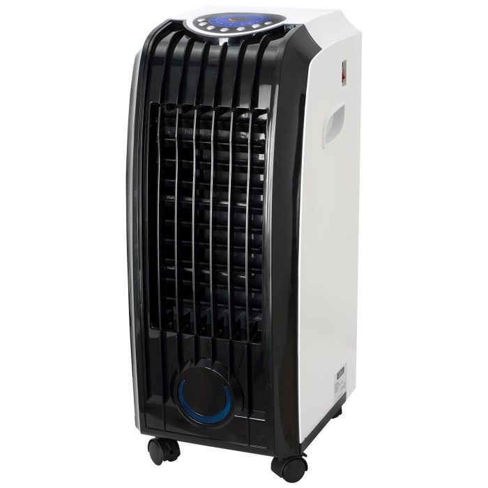 LED dodirna ploča, spremnici za zamrzavanje vode, 3 brzine rada ventilatora, funkcija oscilacije, funkcija ionizacije, pokzatelj razine vode u spremniku, kapacitet spremnika 4 lit., timer 0.5 - 7.5 h, 4 kotača za lako pomjeranje, daljiski upravljač, snaga 60 W