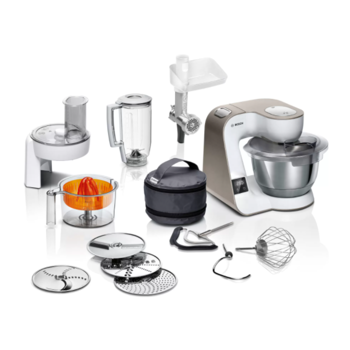 BOSCH kuhinjski aparat MUM5XW40; Boja: BIJELA/ŠAMPANJAC; 1000W, INOX posuda: 3.9 l; 3D PlanetaryMixing; 7 Brzina; Integrisana vaga; Sjeckalica ( rezanje,mljevenje,ribanje),Blender, Mesoreznica, Cijedilo za argume, SI