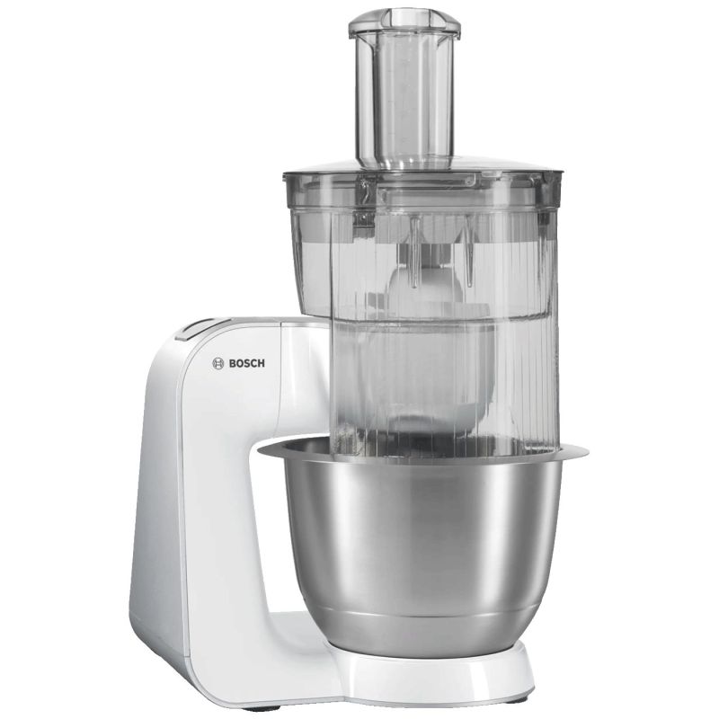 BOSCH kuhinjski aparat MUM54251 je dostupan u elegantnoj bijeloj i srebrnoj boji, što će se savršeno uklopiti u svaki stil uređenja kuhinje. Sa moćnim motorom snage 900W, ovaj kuhinjski aparat ima snagu da se izbori sa svim zahtjevnim poslovima u kuhinji.