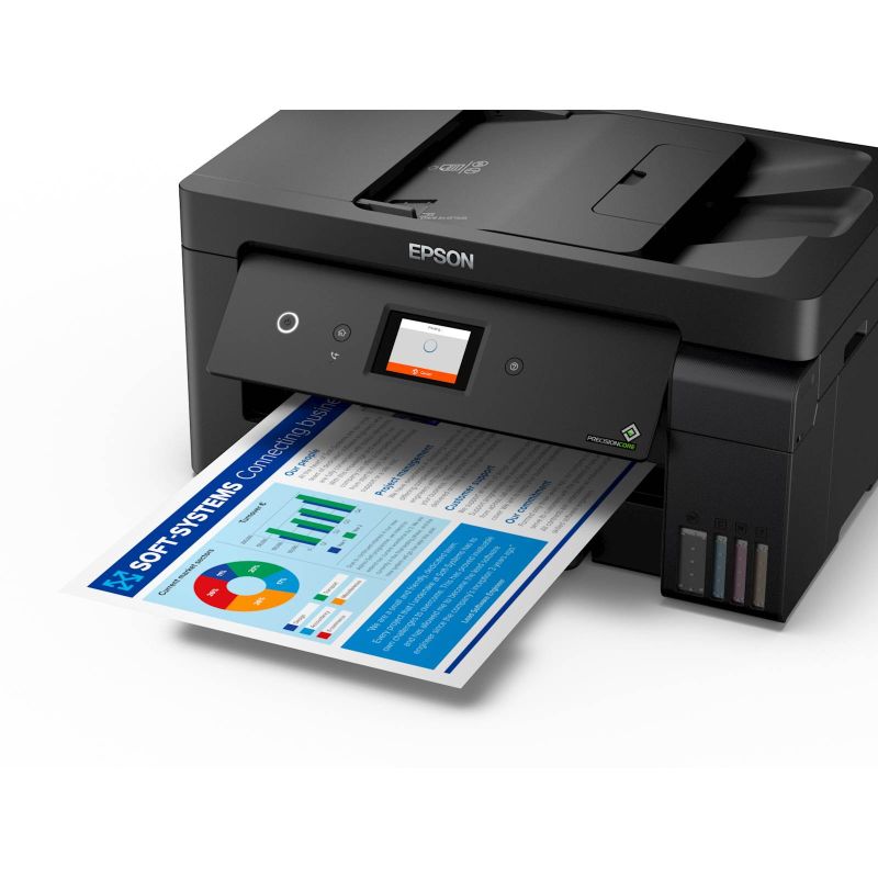 Ispis bez uložaka s tintom Izradujte ispisane primjerke formata A3+ pomocu ovog kompaktnog, brzog i višenamjenskog pisaca EcoTank. Pruža povoljan ispis po stranici, pretinac za papir kapaciteta 250 listova i ADF kapaciteta 35 listova. Tražite li kompaktan i ekonomican pisac u boji za ispisivanje u formatu A3? Pisac L14150 dokazat ce vam da je to moguce. Ovaj pisac EcoTank pruža ispisivanje, skeniranje, kopiranje i slanje telefaksa u formatu A4, kao i mogucnost ispisa u formatu A3 putem stražnjeg ulaza za medije – sve to po iznimno niskom trošku po stranici. Poslovi se mogu brzo obavljati zahvaljujuci velikim brzinama ispisa i skeniranja, prednjem pretincu za papir kapaciteta 250 listova i ADF-u kapaciteta 35 listova formata A4.