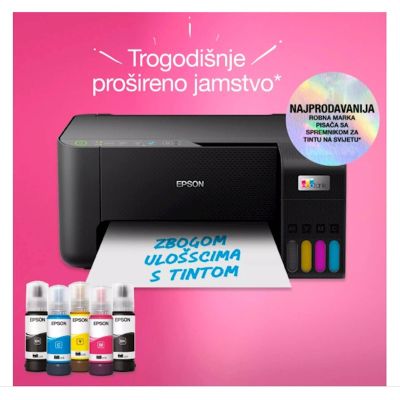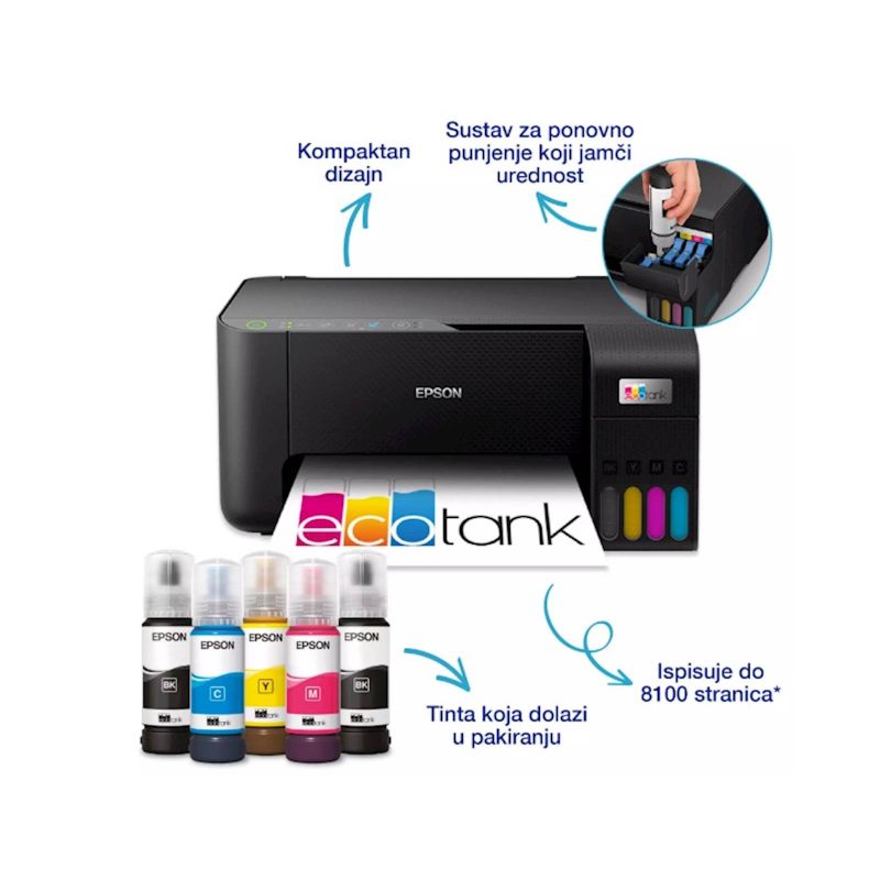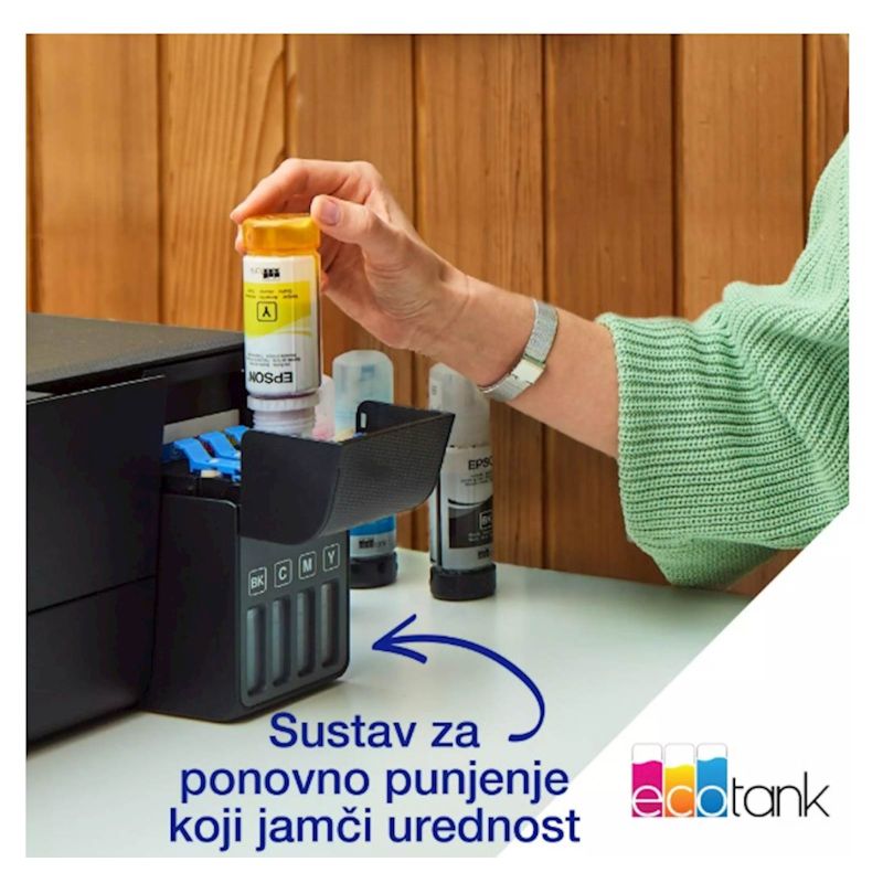 EcoTank omogucuje ispisivanje kod kuce bez briga – spremnici s tintom iznimno visokog kapaciteta omogucuju nadopunjavanje bez nereda, a poseban dizajn bocica je osmišljen tako da se mogu umetnuti samo ispravne boje. Posjeduje prednji spremnik za tintu na kojem je lako vidjeti kada je potrebno dodatno punjenje. Aplikacija Epson Smart Panel omogucuje vam potpuno upravljanje pisacem s pametnog uredaja. Možete ispisivati, kopirati i skenirati dokumente i fotografije, postaviti, nadgledati i rješavati probleme sa svog telefona ili tableta.