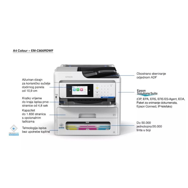 EM-C800RDWF inkjet štampac nudi rešenje za efikasno, neprekidno štampanje velikog obima bez promjene potrošnog materijala. Sa besprijekornom integracijom (sa rješenjima trecih strana), malim otiskom i niskim ukupnim troškovima vlasništva (TCO), idealan je za sva preduzeca. Mala potrošnja energije, brzo vrijeme izlaza prve stranice, te brzina štampanja od 25 stranica u minuti cine ovo odlicnim za kancelarijska okruženja.