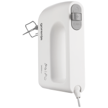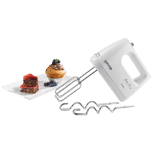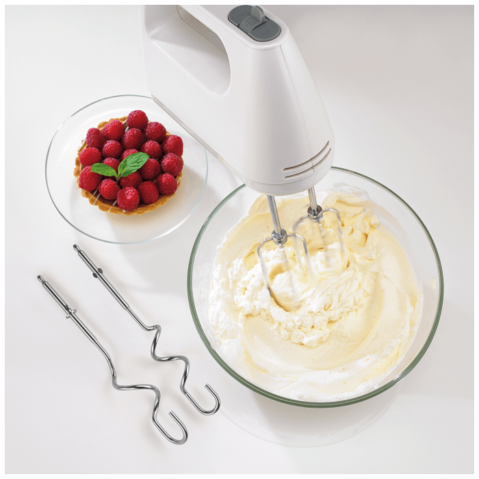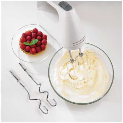 Mikser, snaga motora 345 W, na izmjeničnu struju AC, pranje nastavaka u mašini za pranje posuđa za brzo i efikasno čišćenje, jednostavno čišćenje, gumb za uključivanje/isključivanje i rotirajući gumb za regulaciju, 5 brzina, turbo gumb za trenutnu dodatnu snagu, izbacivanje metlica s pritiskom na gumb, štapni nastavak od nehrđajućeg čelika, nastavci za različitu upotrebu: izuzetno učinkovite metlice za miješanje i mućenje, inovativne metlice za tijesto, prostor za smještanje priključnog kabla za jednostavno spremanje, materijal kućišta metal, boja bijela, dužina priključnog kabla 1.3 met