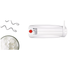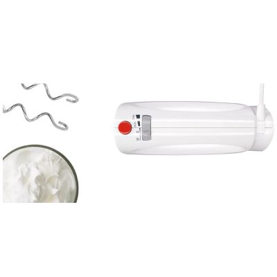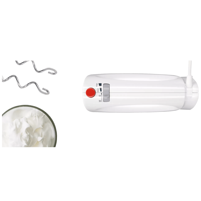 Ručni mikser, snaga motora 300W, 2 radne brzine + turbo, ergonomsko oblikovano kućište od otporne plastike, prikadan i za ljevoruke, tipka za izbacivanje metlica, dužina napojnog kabla 1,4 met