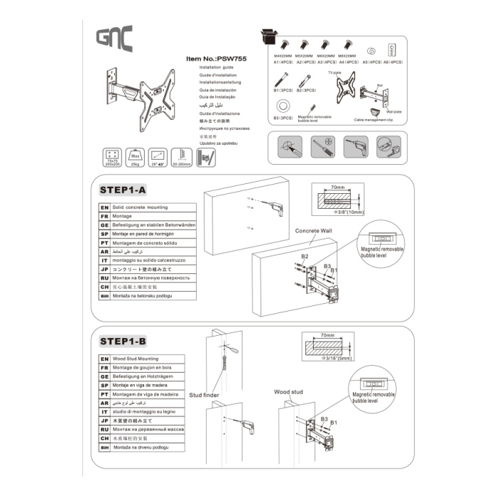 Zidni nosač GNC PSW755 26"-43" vesa 200 X 200 nosivost 22kg nagib