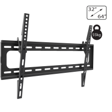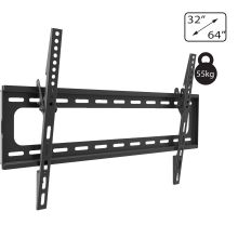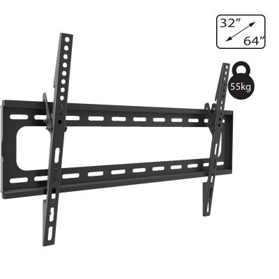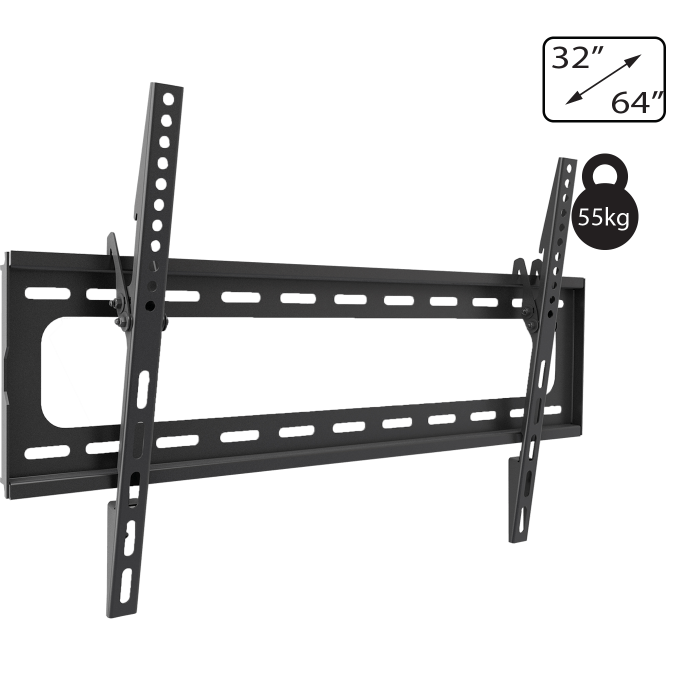 Zidni nosač za TV prijemnike od 32" do 64", maximalno opterećenje 55 kg, udaljenosto od zida 24 mm, tilt 0-15°, VESA 100x100, 200x100, 200x200, 300x200, 300x300, 400x200, 400x300, 400x400, 600x400, jednostavno za montažu i rukovanje, sadrži set vijaka, libelu i upute za uporabu