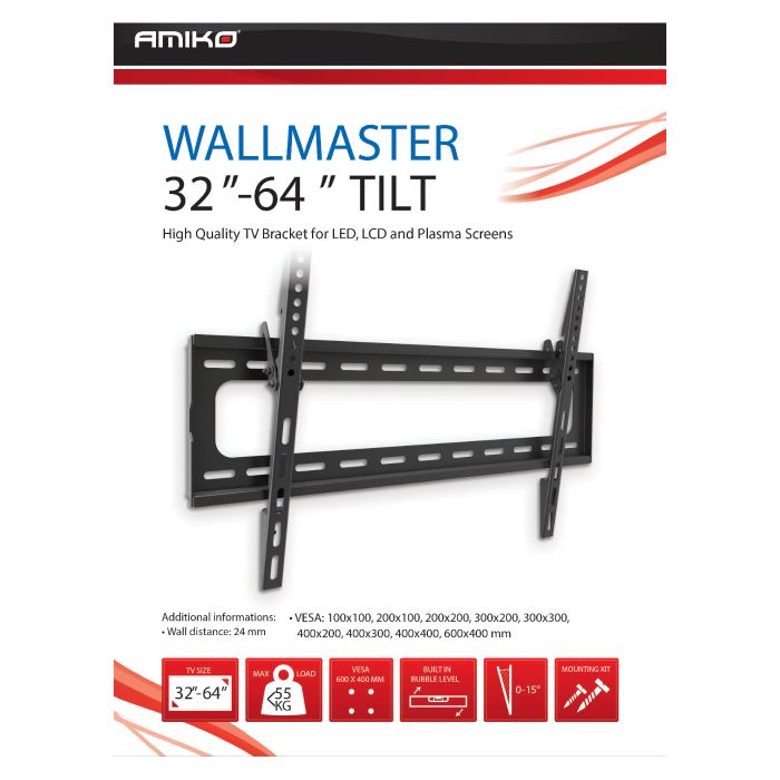 Amiko Nosač zidni za TV prijemnik 32" - 64", 55 kg, 2D - Wallmaster 32-64 Tilt