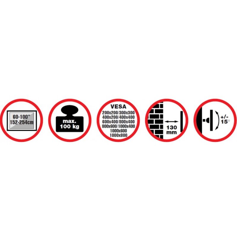 Model PLANO Flat 100-10080T posebno je dizajniran za sve zakrivljene i ravne televizore od 60"-100" do 100 kg. Njegova automatska opružna brava s klikom i jednostavnim otpuštanjem lako i sigurno pricvršcuje vaše super velike ravne panele na zid. Omogucuje jednostavno naginjanje za 15° gore i 15° dole bez upotrebe alata. Cvrstoca je testirana na najmanje cetiri puta vecu nosivost od navedene.