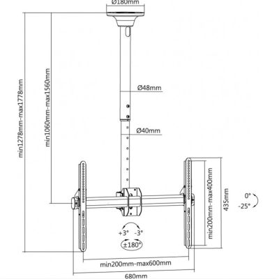 PALLAS 70-6040T je stropni nosac s potpunim pomicanjem, dizajniran kako bi ponudio vrhunsku svestranost i univerzalnu kompatibilnost. Stropna ploca je fiksirana samo za primjenu na ravnom stropu. Omogucuje naginjanje i okretanje zaslona oko stupa bez alata. Ukljucuje VESA plocu za smještaj gotovo svakog ravnog televizora ili monitora od 37" - 70" do 50 kg. Ima podesivu visinu za savršeno pozicioniranje televizora i kanal za upravljanje kablovima kako bi kabeli bili skriveni i organizovani.