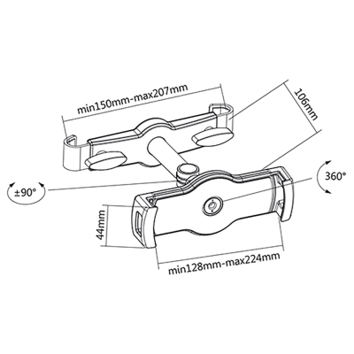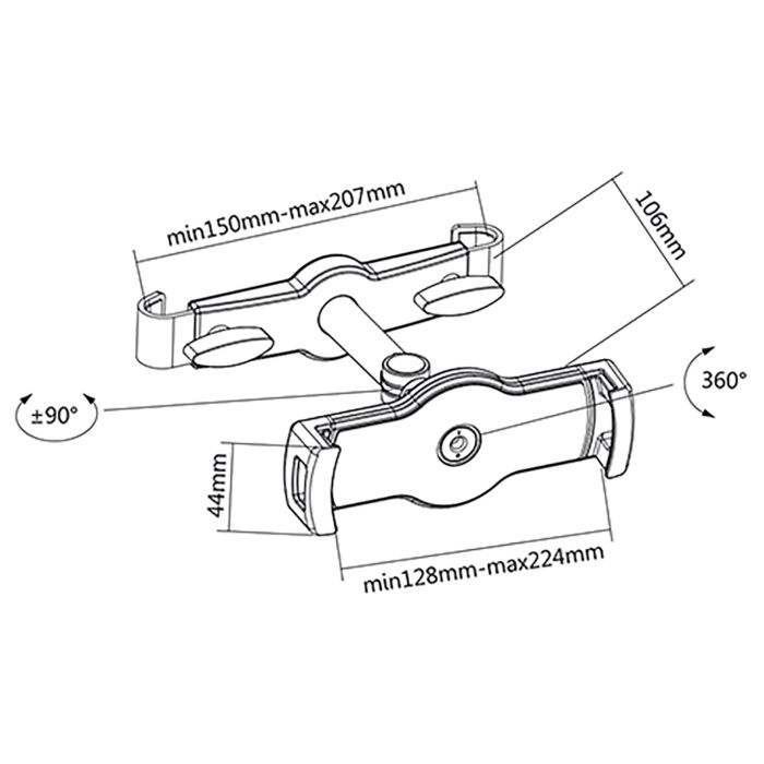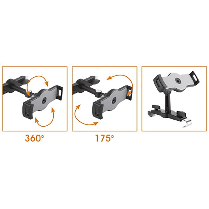 Auto nosač za tablet, 4.7" - 12.9", montaža na naslonjač za glavu, nagib 175°, zakretanje 360°, raspon stezaljki 12.8 - 22.4 cm