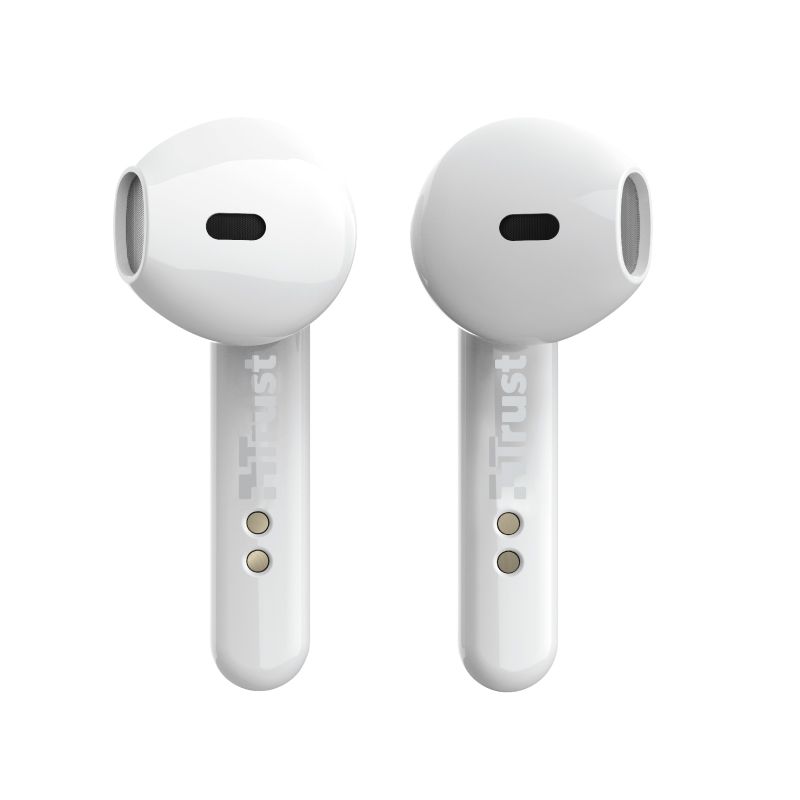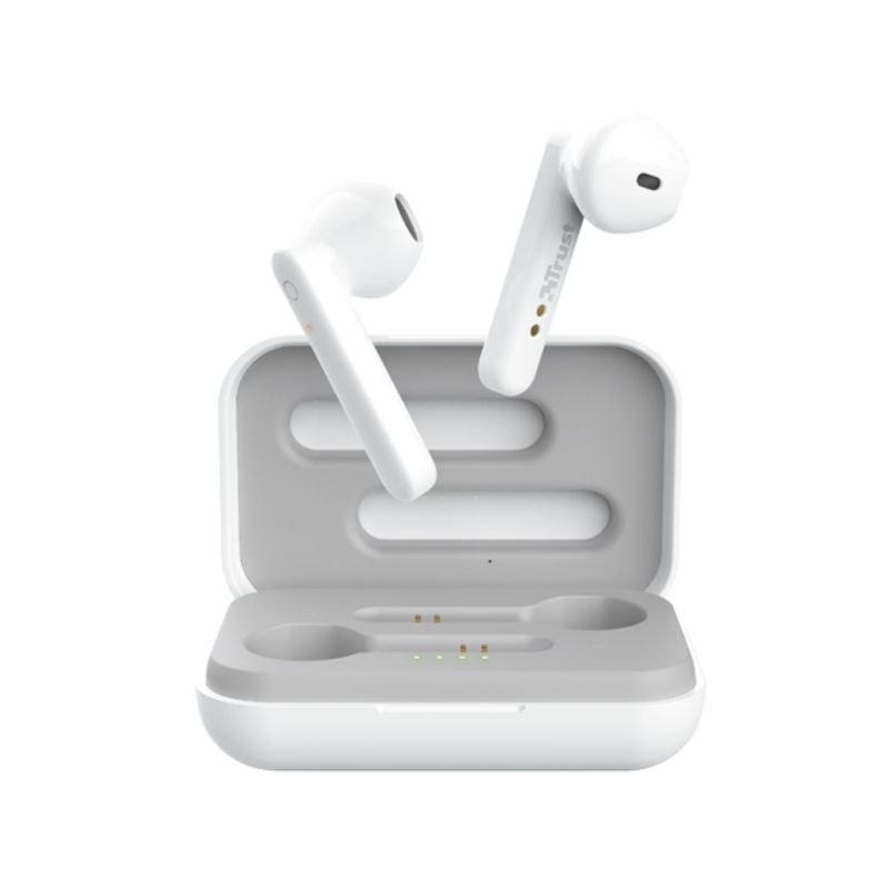 Trust Primo Touch bluetooth slušalice, bijele, wireless domet 10 m, playing time do 4 sata, punjivo kućište za dodatnih 10 sati korištenja.