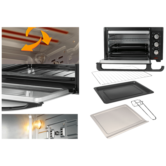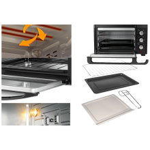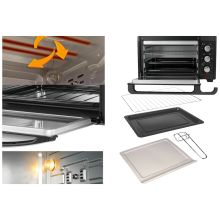 Multifunkcijska mini pećnica, snaga 1380 W, zapremina 19 lit., podesiva temperatura pečenja 100 - 230 °C, prekidač za odabir 6 načina rada, 60-minutnim timer, dvostruko ostakljena vrata,
