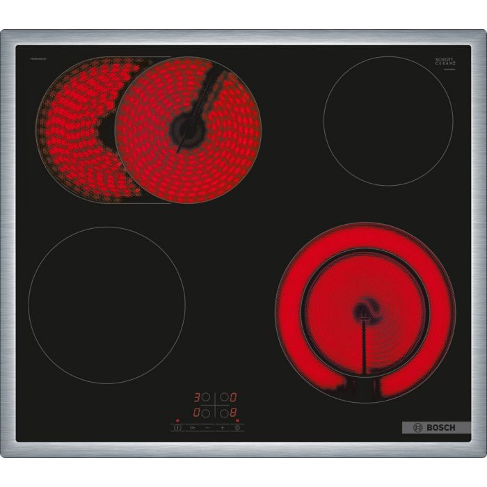 BOSCH Staklokeramička ploča PKN645BA2E zamjena za PKN645BA1E Serie 4|; 60 cm; TouchSelect; INOX okvir; 4 HighSpeed polja za kuhanje; 1 dvokružno; 1 ovalno proširivo; DE