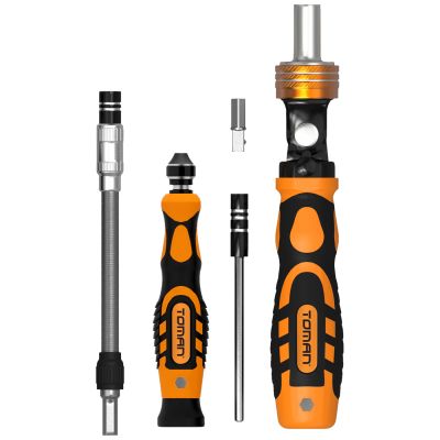 Set uključuje 1 zasebni magnetni držač bitova, 1 odvijač sa račnom i fleksibilnom glavom (levi/desni smer), 1 odvijač sa fiksnom glavom (leva/desna ruka), 1 fleksibilni nastavak, 1 fiksni nastavak, 1 AD nastavak, H4 * 45 mm dugačak bit: PH1.0 / 1,5; SL2.0; precizan set P2 / P5; T2