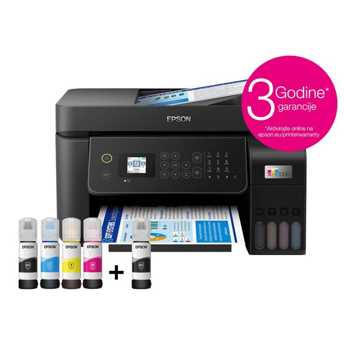 Recite zbogom ulošcima sa tintom Uživajte u bežicnom ispisu poslovne kvalitete uz iznimno niske troškove uz ovaj višenamjenski tintni pisac s faksom, savršen za užurbane domove i male urede Uštedite do 90 % na troškovima ispisa1 uz Epsonove pisace EcoTank bez uložaka. Zahvaljujuci posebno izradenim bocicama s tintom, ugradeni spremnici s tintom iznimno velike iskoristivosti jednostavno se pune. Bez uložaka s tintom za zamjenjivanje, s fleksibilnim znacajkama spojivosti i ADF-om, ovo je savršen pisac za sve koji traže ispis visoke kakvoce uz nevjerojatno nizak trošak po stranici.
