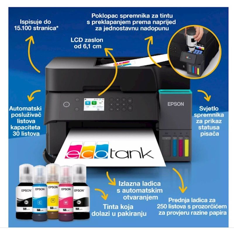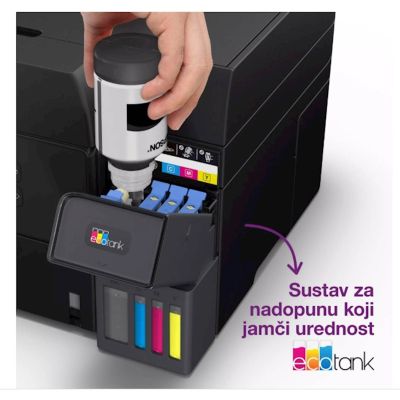 EcoTank L6370 omogucava jednostavan ispis kod kuce i u uredu. Spremnici za tintu su velike zapremine koji omogucavaju nadopunjavanje bez nereda, a poseban dizajn bocica je osmisljen tako da se mogu umetnuti samo ispravne boje. Zaliha tinte za do tri godine u pakiranju. Prilozena tinta ispisuje do 15.100 crno-bijelih stranica i 5.500 stranica u boji. Pouzdana bezicna i zicana spojivost omogucuje vam ispis s bilo kojeg mjesta. Upotrijebite aplikaciju Epson Smart Panel za postavljanje, nadzor, ispis i jos mnogo toga s mobilnog uredaja.