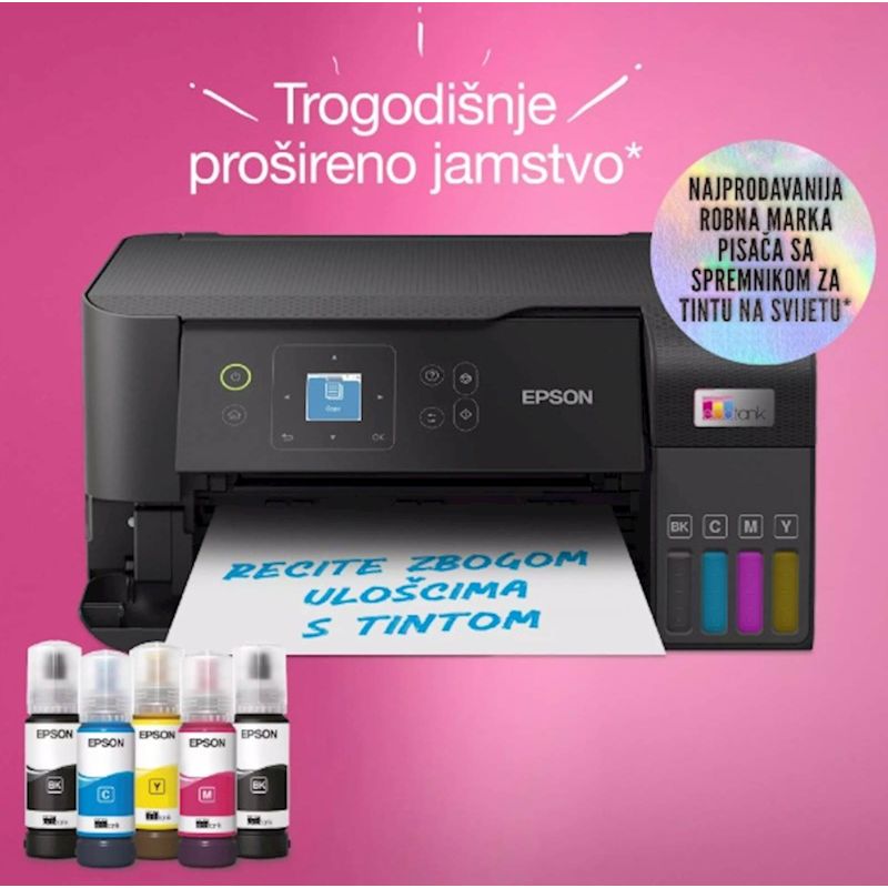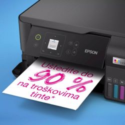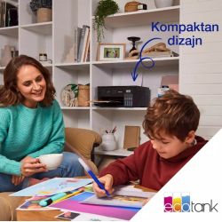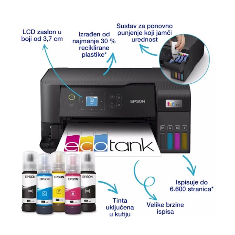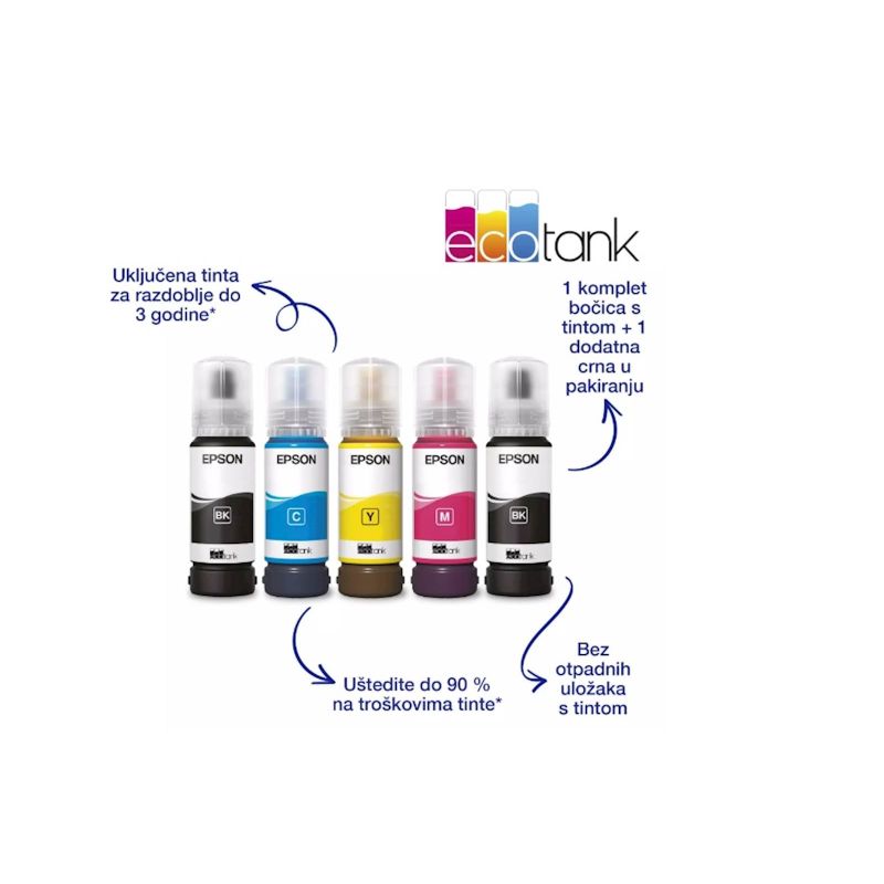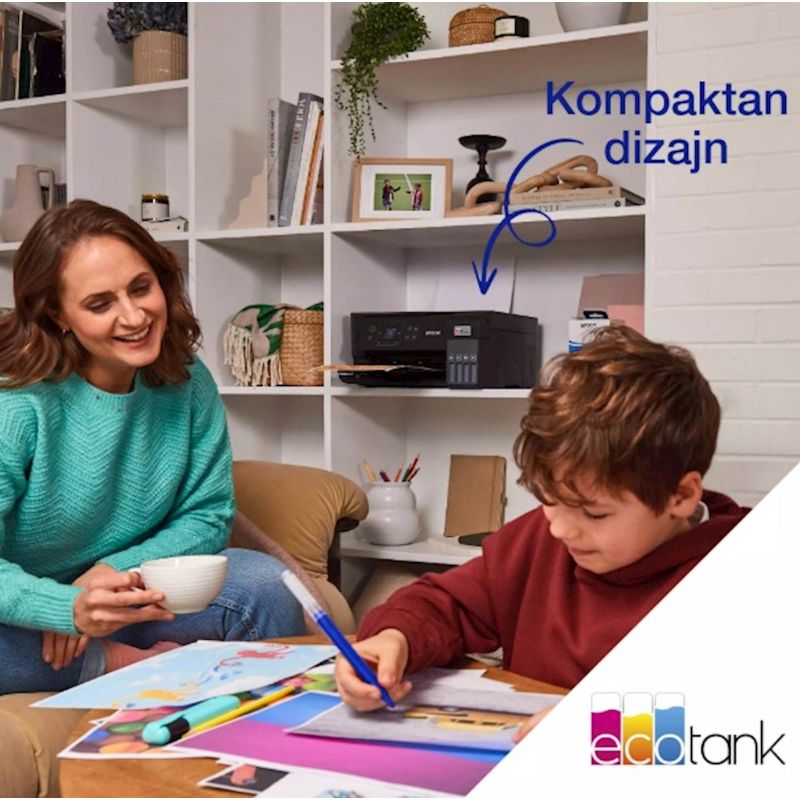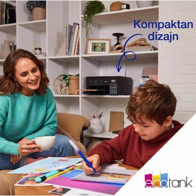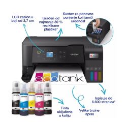 EcoTank omogucuje ispisivanje kod kuce bez briga – spremnici s tintom iznimno visokog kapaciteta omogucuju nadopunjavanje bez nereda, a poseban dizajn bocica je osmišljen tako da se mogu umetnuti samo ispravne boje. Ovaj ekonomicni printer štedi do 90% na troškovima ispisa i u pakiranju je priložena zaliha tinte u trajanju do tri godine. Ispišite do 6600 crno-bijelih stranica i 5900 stranica u boji s priloženom tintom. Uz kompaktan dizajn i potpunu spojivost putem Wi-Fi mreže i Wi-Fi Direct-a, možete jednostavno integrirati ovaj printer s postojecim kucnim uredajima i ispisivati s mobilnih uredaja, tableta i prijenosnih racunara.