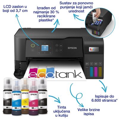 Brand: §Funkcije Printera:Printer + Kopir + Skenter + Fax§Vrsta printera:Inkjet§Format:A4§Format:A5§Format:A6§Format:B5§Format:B6§Format:C6§Format:DL§Format:Br. 10§Potrošni materijal:Epson 103 EcoTank Black ink bottle§Potrošni materijal:Epson 103 EcoTank Cyan ink bottle§Potrošni materijal:Epson 103 EcoTank Magenta ink bottle§Potrošni materijal:Epson 103 EcoTank Yellow ink bottle§Štampa u boji:8str/min§Crno-Bijela štampa:15str/min§Rezolucija Štampe:1200 DPI§Procesor:-§Memorija:-§Dvostrana štampa (Duplex):Manuelni (Pročitati uputstvo)§ADF:Ne§Ulazni kapacitet papira:30 papira§Maksimalni mjesečni broj strana:Do 50.000 strana§LAN Povezivanje:Ne§USB Povezivanje:Da§WiFi Povezivanje:Da§NFC Povezivanje:Ne