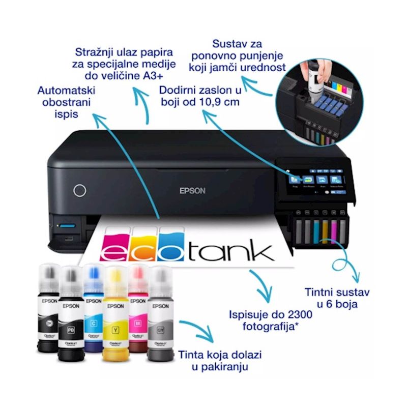 Oslobodite svoju kreativnost zapanjujucim fotografijama i dokumentima u formatu A3+ uz iznimno nizak trošak po stranici. Ispisujte, kopirajte i skenirajte s lakocom uz pomoc impresivnog dodirnog zaslona od 10,9 cm, rukovanja medijima u pet smjerova i inovativnog tintnog sistema u 6 boja. Bez neurednih tintinih uložaka za zamjenu i uz fleksibilne znacajke spojivosti ovo je savršen printer za modernu umjetnicku obitelj.
