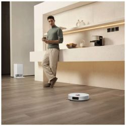 - Automatsko pranje i sušenje: rotirajuće krpe za brisanje prije početka rada natope se vodom na postolju bazne stanice, nakon što robotski usisavač završi s čišćenjem bazna stanica automatski čisti krpe centrifugalnim rotirajućim procesom, a potom ih suši toplim zrakom pripremajući ih za sljedeće čišćenje