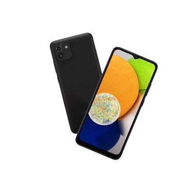 Samsung Galaxy A03 u crnoj boji. LCD ekran veličine 6.5 inča sa brzinom osvježavanja 60 Hz. Težak je 199g. Interna memorija je 64 GB, a moguće je proširiti sa memorijskom karticom. RAM veličina 4 GB. Posjeduje dvije glavne kamere sa rezolucijom 48 MP i prednju kameru sa 5MP. Operativni sistem Android. Moguće je koristiti dvije SIM kartice. Verzija 5.0 bluetooth.